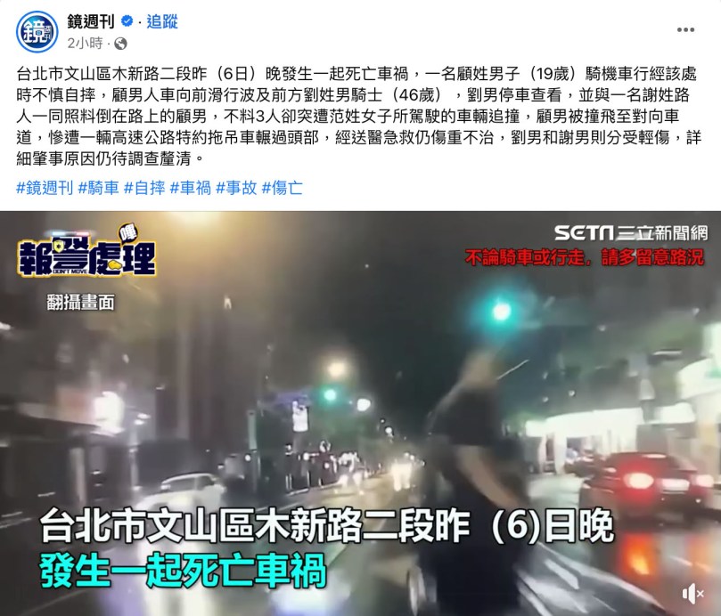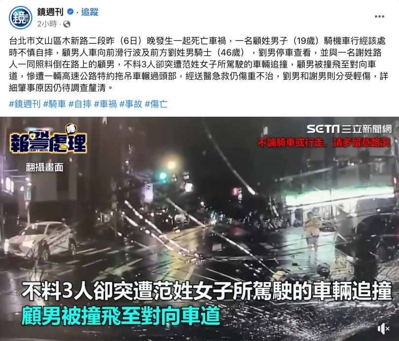 19歲男騎車自摔後,遭後車撞飛至對向車道,又慘被拖吊車輾斃